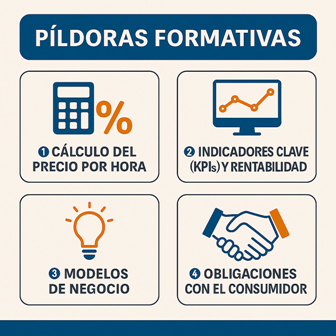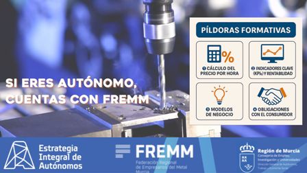 La Oficina del Autónomo de la Federación Regional de Empresarios del Metal de Murcia (FREMM) ha elaborado cuatro "píldoras" informativas sobre el cálculo del precio hora, indicadores claves de rendimiento, modelos de negocio y obligaciones ante los consumidores.