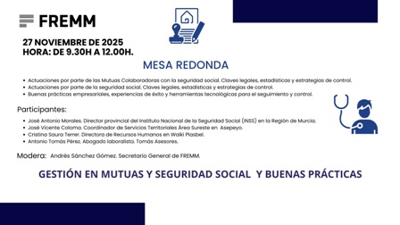 Moderada por Andrés Sánchez Gómez, secretario General de FREMM, participarán José Antonio Morales; José Vicente Coloma, coordinador de Servicios Territoriales Área Sureste en Asepeyo; Cristina Saura Terrer, directora de Recursos Humanos en Walki Plasbel; y Antonio Tomás Pérez.