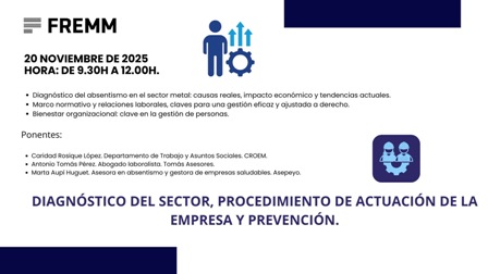 La jornada partirá de un diagnóstico del absentismo en el sector metal: causas reales, impacto económico y tendencias actuales. Se analizará, asimismo, el marco normativo y las claves para una gestión eficaz y ajustada a derecho. Concluyendo con la definición de bienestar organizacional, clave en la gestión de personas. Los ponentes serán Caridad Rosique López, departamento de Trabajo y Asuntos Sociales de CROEM; Antonio Tomás Pérez, abogado laboralista en Tomás Asesores; y Marta Aupí Huguet. asesora en absentismo y gestora de empresas saludables de Asepeyo.